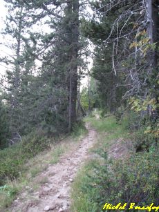 prendre le chemin qui monte (panneau Cami de Les Agols refugi). Le chemin d'exploitation laisse place à un sentier bien balisé. Vous arrivez à un panneau indiquant le refuge à 1h35. Le chemin se poursuit en sous-bois pendant une heure avant d'arriver à un second panneau donnant 35 mn pour arriver, puis un troixième panneau indiquant Les Agols sur votre droite, puis après 5mn de marche un troixième panneau. Le parcours monte assez raide par moments. Le sous-bois laisse progressivement place à des zones plus ouvertes avant d'arriver au refuge. De part en part nous avons de belles vues sur la vallée et sur le pic de Casamanya.